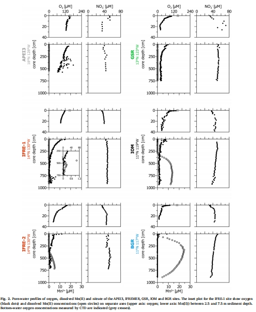 識別深層氧化過程:在IFRE-1、IOM和BGR站點,電極顯示深層氧氣回升(如BGR站點~9.25 m),結合Mn2?下降(圖2),證實基底氧氣擴散導致Mn2?氧化。這一發(fā)現揭示了海底水文對沉積物化學的深遠影響。