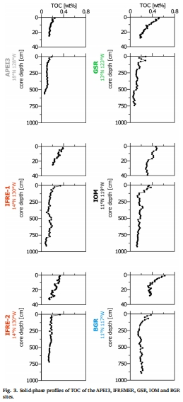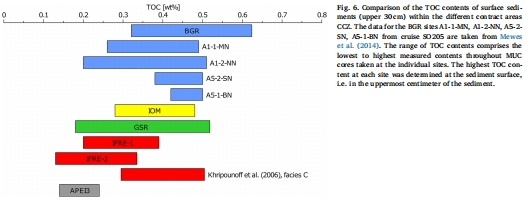 數據:表層TOC含量0.2-0.6 wt%(APEI3最低),隨深度降至<0.1 wt%(圖3)。合同區(qū)TOC高于APEI3(圖6)。