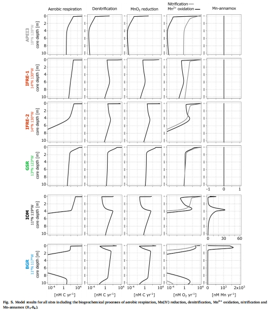 研究意義:量化過程貢獻。模型驗證好氧呼吸主導,錳還原微弱,深層Mn2?氧化廣泛(如BGR站點9.25 m深度)。