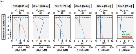識(shí)別亞氧化帶和微生物活動(dòng):O?和H?S剖面的反相關(guān)關(guān)系(如站點(diǎn)1-2出現(xiàn)無O?無H?S的亞氧化帶)是Beggiatoaceae細(xì)菌活動(dòng)的典型標(biāo)志。pH剖面顯示表層pH升高(站點(diǎn)1達(dá)8.7)、深層降低,符合硫氧化反應(yīng)的質(zhì)子消耗-產(chǎn)生模式,微電極數(shù)據(jù)從而證實(shí)了細(xì)菌對氧化還原界面的生物調(diào)控作用。