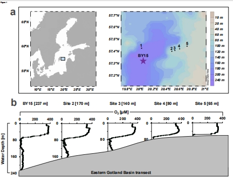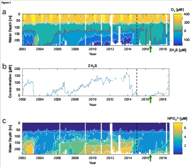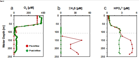 摘要指出,波羅的海是全球最大的人類活動(dòng)誘導(dǎo)缺氧水體區(qū)。2014-2015年的主要波羅的海流入事件將含氧北海水體引入東哥特蘭盆地深層,導(dǎo)致水深125米以下水體氧氣上升和磷酸鹽下降。研究發(fā)現(xiàn):