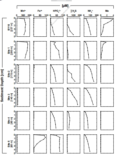 數(shù)據(jù)內(nèi)容:Mn2?、Fe2?、HPO?2?、NH??、ΣH?S和鉬的垂直分布。