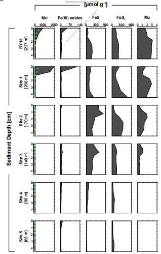 孔隙水化學(xué):分析Mn2?、Fe2?、HPO?2?、NH??、ΣH?S和鉬的垂直分布(圖7、8)。