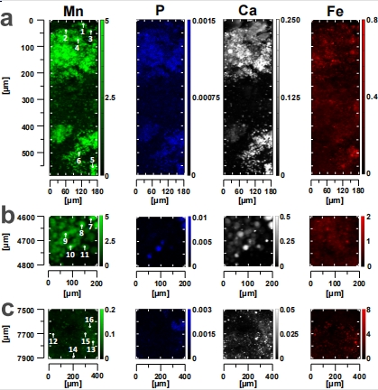 數(shù)據(jù)來源:圖12(桌面μXRF顯示Mn-P-Ca共分布)、圖13(同步輻射μXRF圖譜)、圖14(XANES譜圖)。