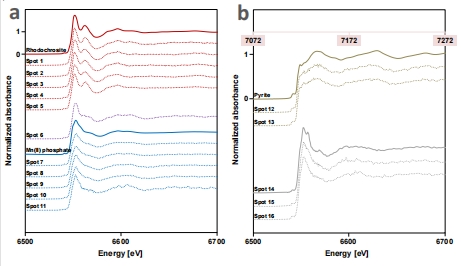 礦物學(xué)表征:采用桌面μXRF(圖12)、同步輻射μXRF(圖13)和X射線吸收光譜(XANES,圖14)鑒定錳和鐵的礦物相。