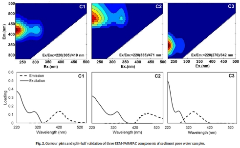 光學特性:UV吸收(SUVA???、SR)和熒光EEM結合PARAFAC分析,獲取熒光指數(FI、HIX、BIX)和DOM組分(C1、C2、C3)(圖2)。