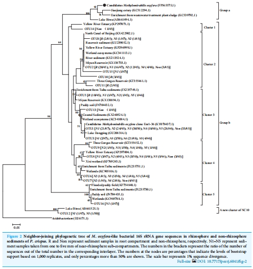 普遍存在:M. oxyfera-like細菌在所有區(根際、近根際、非根際)均被檢測到,16S rRNA基因序列歸屬于16個OTUs。