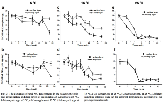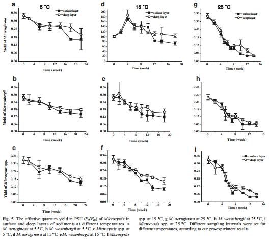 毒素和光合活性:微囊藻毒素(MC)含量在5°C和15°C下穩(wěn)定,在25°C下顯著下降;光合活性(Fv/Fm)隨溫度升高而降低。