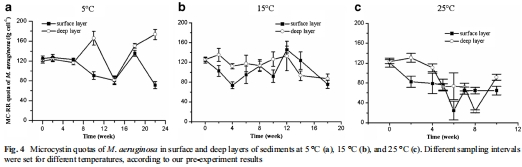 條件控制:設(shè)置3個溫度(5°C、15°C、25°C)和2個沉積層(表層好氧、深層厭氧),分組添加單種或混合Microcystis,黑暗孵化22周。
