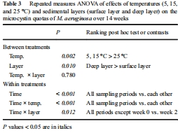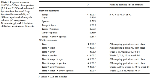 統(tǒng)計分析:重復(fù)測量ANOVA檢驗溫度、沉積層和物種的影響,使用邏輯模型擬合存活動態(tài)。