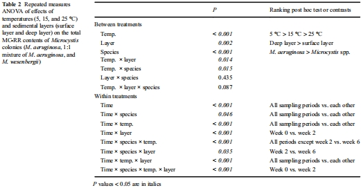 數(shù)據(jù)內(nèi)容:總MC含量在5°C和15°C下穩(wěn)定,25°C下顯著下降;MC配額在5°C和15°C下波動但總體穩(wěn)定,25°C下顯著降低。