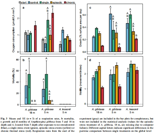 比較種內和種間熱應力耐受性:評估A. gibbosa從不同深度(5m vs. 18m)的響應差異,以及A. lessonii與A. gibbosa的種間差異。