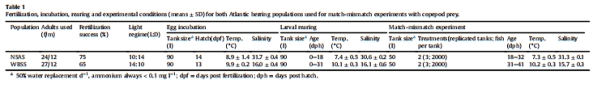 生物材料:NSAS和WBSS鯡魚幼體(分別于7°C和10°C培養(yǎng)),設(shè)置匹配(持續(xù)投喂 A. tonsa)與不匹配(初始投喂后禁食)處理(見Table 1)。