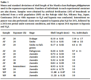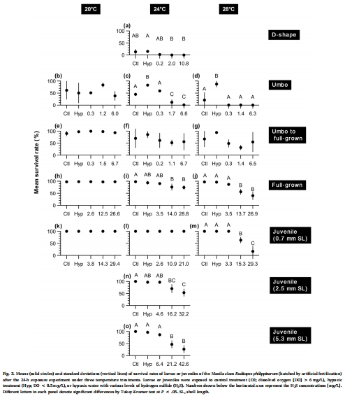 Ontogenetic and temperature-dependent changes in tolerance to hypoxia and hydrogen sulfide during the early life stages of the Manila clam Ruditapes philippinarum