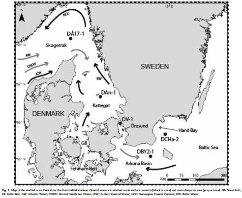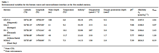 站點選擇:在2013年11月,沿從斯卡格拉克(D17-1站,328m)到波羅的海南部漢灣(DCHa-2站,71m)的斷面,選擇了五個站點(圖1),涵蓋了巨大的鹽度(35.2 到 14.1)、pH和氧濃度梯度。