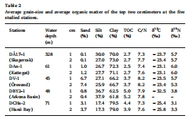 數(shù)據(jù):包括沉積物粒度組成(砂、粉砂、粘土百分比)、總有機碳(TOC)、總氮(TN)、C/N比和有機質穩(wěn)定同位素(δ13C, δ15N)。