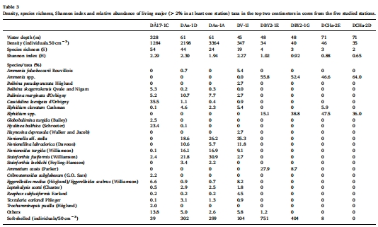 數(shù)據(jù):活體有孔蟲密度(ind./50 cm3)、物種豐富度(S)、香農多樣性指數(shù)(H')、主要物種的相對豐度(%),以及通過顯微鏡觀察到的殼體溶解現(xiàn)象。