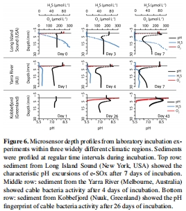 研究意義:這些剖面是識別電纜細菌活動的直接證據(jù)。e-SOx會導致典型的化學特征:表層氧化區(qū)出現(xiàn)pH極大值(因氧還原消耗質(zhì)子),深層出現(xiàn)pH極小值(因硫氧化產(chǎn)生質(zhì)子),并形成寬闊的亞氧化區(qū)(O?和H?S均缺失)。例如,F(xiàn)igure 1示意圖展示了該代謝過程,F(xiàn)igure 3和 Figure 6的剖面數(shù)據(jù)直接顯示了不同站點的這種指紋。這些數(shù)據(jù)證明了電纜細菌在多種環(huán)境中的活性,并允許定量比較活動強度(如pH偏移幅度ΔpH)。