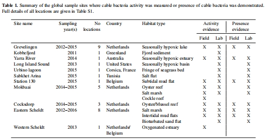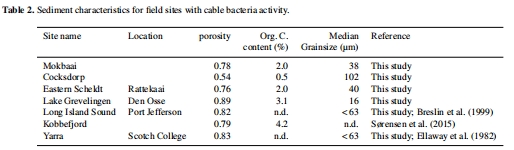 研究意義:這些數(shù)據(jù)用于分析電纜細菌分布的環(huán)境控制因素。例如,Table 1顯示電纜細菌在有機質(zhì)豐富的細粒沉積物中更常見,有助于定義其生態(tài)位。