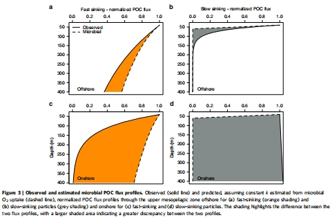 微生物是OMZ中碳再礦化的主角:在ETNP遠海OMZ,微生物呼吸是POC通量衰減的主要途徑,貢獻率高達約70%。這與溫帶富氧水域形成鮮明對比,后者浮游動物攝食和破碎是主要機制。