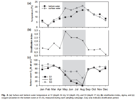 測量指標:底層水溫度、鹽度、溶解氧濃度的垂直剖面和時序變化。圖2清晰地展示了水體分層指數(σ)和底層水氧飽和度(%)的季節性動態。