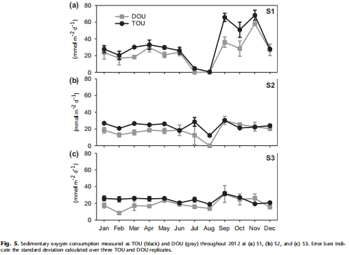 底棲動物的作用有限:由于夏季缺氧導致深水區底棲動物群落崩潰且恢復緩慢,其通過生物擾動和灌溉對沉積物耗氧的貢獻在整個年度周期中相對較小。這解釋了為何TOU和DOU在大部分時間非常接近。