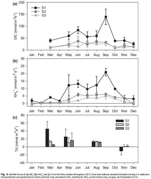 測量指標:總耗氧率(TOU)、擴散氧吸收率(DOU)、溶解無機碳(DIC)通量、銨(NH??)通量和 總堿度(TA)通量。圖5展示了TOU和DOU的季節變化,圖6展示了DIC、NH??和TA的通量。