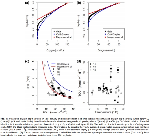 研究意義:OPD非常淺(通常1-2 mm),反映了沉積物的高代謝活性。OPD與DOU的關系圖(圖8c)顯示數據點落在“均勻呼吸”和“界面再氧化”兩種理論模型之間,但更靠近后者,表明還原性物質的再氧化是耗氧的重要組成部分。這些高分辨率剖面是區分不同耗氧機制的基礎。