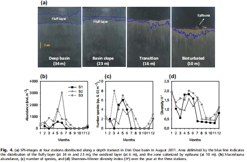 測量指標:大型底棲動物的豐度、物種豐富度、香農-威納多樣性指數。圖4b, c, d展示了這些參數的季節變化。