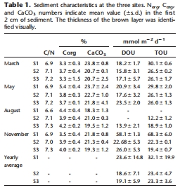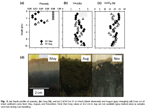 測量指標:沉積物孔隙度、有機碳(Corg)含量、CaCO3含量的垂直分布。圖3a, b, c展示了S1站點的典型剖面。