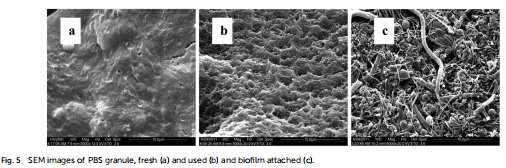 研究意義:圖4顯示PBS重量線性下降,降解速率約為0.04 mg d?1,估算其有效使用壽命約1年。圖5a, b的SEM對比直觀展示了微生物對PBS表面的腐蝕。圖6的FT-IR光譜表明PBS降解后羥基峰增強,說明發生了水解。這些數據證實了PBS的可生物降解性,并為其消耗速率的計算提供了依據。實際PBS消耗量為2.75 ± 0.72 g PBS/g NO??-N,略高于理論值,可能部分碳源被好氧呼吸消耗。