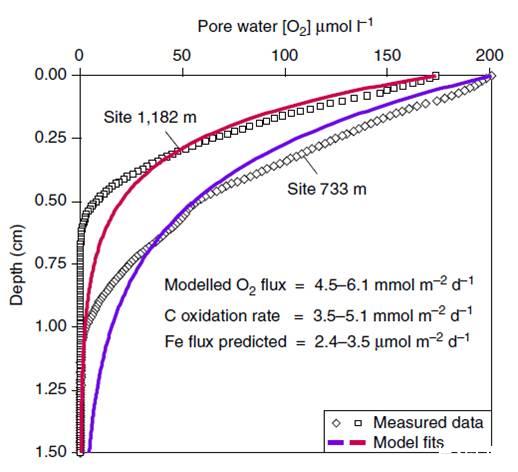 圖5、海水底棲區域的鐵、氧通量預測。其中◇□標示代表的是實驗測試的數據。--代表的是對測試進行相非線性擬合獲得的擬合曲線。從曲線中可以看出,在不同深度(1182m、733m)處獲取的海底沉積物測試的沉積物氧濃度剖面分析圖可以看出,在較淺區域取的海洋沉積物樣品中孔隙水的氧濃度較大。對比沉積物孔隙水中的氧濃度消耗情況隨深度的變化是符合有機碳氧化機制的,而有機碳氧化速率可以預測大陸海洋邊緣底棲區域鐵通量的觀測。