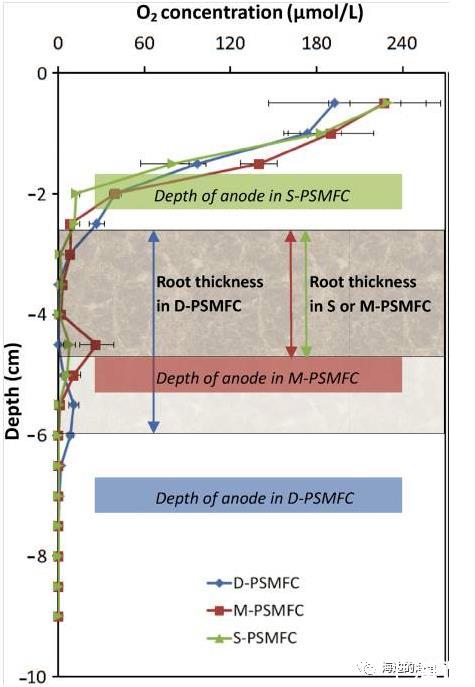 微電極的應(yīng)用介紹:采用氧氣微電極傳感器(unisense微電極分析系統(tǒng))測定了PSMFCs體系砂中氧的濃度分布剖面。研究發(fā)現(xiàn)植物根系可以釋放氧氣,在沙中氧氣梯度的驅(qū)動(dòng)下向上和向下輸送,形成根際微氧環(huán)境。對(duì)植物沉積物微生物燃料電池(DPSMFCs、M-PSMFCs,S-PSMFCs)的微剖面進(jìn)行分析,從水沙界面處到沙土下-3.5cm或4.0cm處,氧的濃度明顯降低到接近于零,而沙土表面更深處(-5.0cm—7.0cm)能觀察到明顯的氧損失帶,距離沙土表面5cm處對(duì)應(yīng)的氧的最大濃度為10.8umol/L。這些研究數(shù)據(jù)表明,當(dāng)將陽極置于根的下方,并保持適當(dāng)?shù)木嚯x,使PSMFCs能夠利用根源有機(jī)物,可以很好的避免氧損失的負(fù)面影響。此研究表明一定的氧損傷可以控制植物沉積物微生物燃料電池(PSMFC)發(fā)電的晝夜節(jié)律。