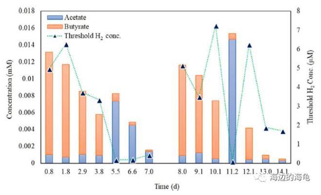 微電極測試燃料生物電池中體系中正丁酸發(fā)酵至醋酸生成的氫氣的濃度隨時(shí)間的變化情況