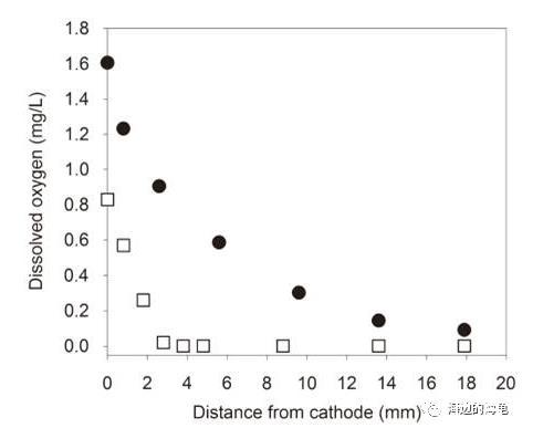 AC-MFC(空氣陰極微生物燃料電池)中離陰極區(qū)域不同距離處的原液中氧氣濃度(其中□表示的是陰極不含有生物膜帶,●表示陰極區(qū)域不含有帶醋酸鹽)