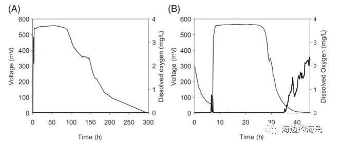 微電極測試AC-MFC(空氣陰極微生物燃料電池)間歇循環(huán)中生物膜內(nèi)的溶氧濃度,研究生物膜的存在對(duì)電壓(細(xì)線)和陽極附近的溶氧(粗線)的影響
