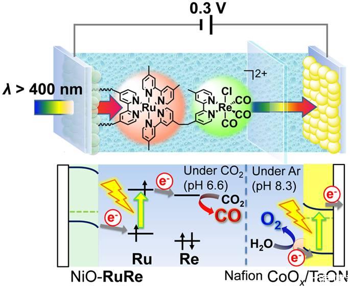 開發(fā)了一種NiO-RuRe混合光電陰極對(duì)二氧化碳進(jìn)行光電還原,并且結(jié)合使用CoOX/TaON光電陽(yáng)極構(gòu)建光電化學(xué)電池來(lái)驅(qū)動(dòng)水的氧化。該光化學(xué)電池在水溶液中應(yīng)用可見光在NiO-RuRe材質(zhì)的陰極上高效的催化生成一氧化碳,這表明該光化學(xué)電池能夠應(yīng)用可見光實(shí)現(xiàn)對(duì)于二氧化碳的還原以及水的氧化生成一氧化碳和氧氣。