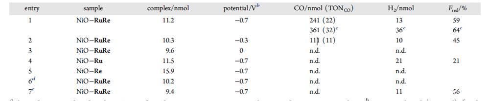 表1、采用不同材料制成的電極材料進(jìn)行光電化學(xué)還原二氧化碳的效率。其中的d表示的是沒(méi)有光照環(huán)境,e指的是體系中的氣體環(huán)境是氬氣。從表中可以看出,只有選擇NiO-RuRe陰極材料時(shí),在進(jìn)行光電化學(xué)還原二氧化碳效率最好,而選用單獨(dú)的NiO-Ru和NiO-Re陰極材料時(shí),其光電催化還原二氧化碳的效率不好。