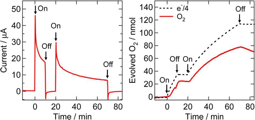 圖4、左邊的圖表示的是陰極為NiO-RuRe陽(yáng)極為CoOx/TaON的混合光電化學(xué)的電流隨時(shí)間的變化情況。右邊的圖表示的是電解水溶液中的氧氣濃度隨時(shí)間的變化情況分析,其中的紅線表示的是氧氣濃度的變化,虛線表示的是體系中生成的電子的隨時(shí)間的變化情況分析。