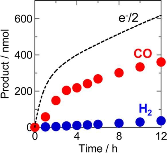 圖2、NiO-RuRe材質(zhì)的光陰電極經(jīng)過(guò)波長(zhǎng)為460nm的光照射后,產(chǎn)生的氣體的量與時(shí)間的關(guān)系。相關(guān)氣體的檢測(cè)是使用了氣相色譜系統(tǒng),從圖中可以看出,隨著時(shí)間的增加,光催化電解水制氧過(guò)程中陰極端主要是將體系中的二氧化碳還原為一氧化碳。