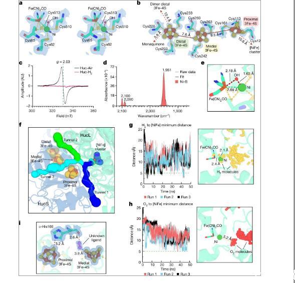 圖3、a)環(huán)境空氣下Huc[NiFe]星團(tuán)的立體圖。b)三個(gè)HucS[3Fe-4S]簇的結(jié)構(gòu)。c)處于分離的氧化態(tài)(Huc-Air)和H 2還原態(tài)(Huc-H 2)的Huc的高溫(30K)EPR光譜。g=2.03處的各向同性信號(hào)(g是朗德因子)與氧化的[3Fe–4S]+簇有關(guān),由于簇的還原,該信號(hào)在Huc-H 2中消失。在H2處理形式的Huc中沒(méi)有可辨別出歸因于還原的[4Fe–4S]+簇的信號(hào)。d)環(huán)境空氣中分離的氧化Huc的FTIR光譜,表明酶的[NiFe]活性位點(diǎn)采用與Ni-B狀態(tài)一致的氧化狀態(tài)。e)Huc[NiFe]活性位點(diǎn),顯示Ni-B態(tài)羥基配體與簇中Ni和Fe離子之間的相對(duì)距離。f)HucSL二聚體,顯示了疏水性氣體通道的位置和寬度,該通道提供底物進(jìn)入[NiFe]活性位點(diǎn)。g)左圖,距離與時(shí)間的關(guān)系圖,顯示在H 2存在的情況下進(jìn)行HucSL分子動(dòng)力學(xué)模擬過(guò)程中,H2與Huc[NiFe]活性位點(diǎn)之間的最近距離。h)與g類(lèi)似,但顯示了在存在O2的情況下進(jìn)行的HucSL模擬中O2相對(duì)于Huc[NiFe]位點(diǎn)的位置。i,HucL D-His166與近端和內(nèi)側(cè)[3Fe-4S]簇的接近度以及未知配體的位置。