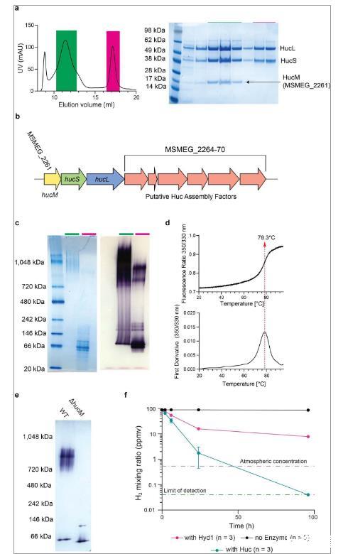 為了解決這些知識(shí)空白,研究人員研究了需氧細(xì)菌恥垢分枝桿菌中大氣H2氧化的結(jié)構(gòu)和機(jī)制基礎(chǔ)。該細(xì)菌擁有2種系統(tǒng)發(fā)育上不同的氫化酶——Huc(2a組)和Hhy(1h組)——均可將H2氧化至低于大氣壓的水平。直接從恥垢分枝桿菌中分離出Huc,并確定了其氧化大氣H2的結(jié)構(gòu)和生化基礎(chǔ)。