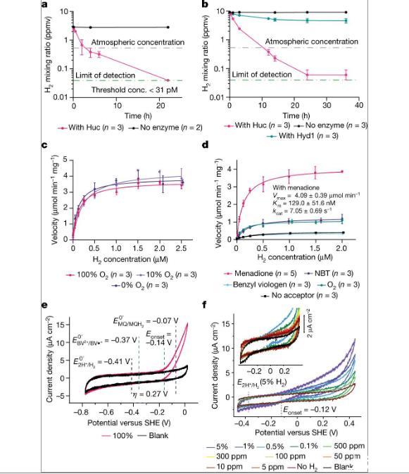 圖1、Huc是一種高親和力的O2不敏感氫化酶。a)用200μM甲萘醌作為電子受體,對(duì)含有Huc或不含酶的密封小瓶頂部空間的H2濃度進(jìn)行氣相色譜分析。Huc可以將低于大氣濃度(紫線(xiàn))的H 2氧化至檢測(cè)限(綠線(xiàn))。濃度,濃度。b)用200μM NBT作為電子受體,對(duì)含有Huc、大腸桿菌Hyd1或不含酶的小瓶進(jìn)行氣相色譜分析。c)Huc在不同O 2飽和百分比的緩沖液中氧化H2的Michaelis-Menten動(dòng)力學(xué)。d)具有不同電子受體的緩沖液中Huc H2消耗的Michaelis-Menten動(dòng)力學(xué),脫氣但含有痕量O2。e)固定化Huc蛋白膜在100%H2氣氛中的循環(huán)伏安圖。f)用包含氬氣、N 2和指示水平的H2的氣體混合物沖洗頂部空間的固定化Huc蛋白膜的循環(huán)伏安圖。