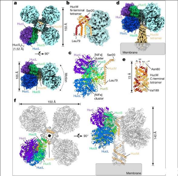 本研究工作提供了一種通過(guò)選擇最佳基質(zhì)剛度來(lái)精細(xì)調(diào)節(jié)破骨細(xì)胞分化的創(chuàng)新方法。多種需氧細(xì)菌利用大氣中的H2作為生長(zhǎng)和生存的能源。這一具有全球意義的過(guò)程可調(diào)節(jié)大氣成分、增強(qiáng)土壤生物多樣性并推動(dòng)極端環(huán)境下的初級(jí)生產(chǎn)。大氣H2氧化歸因于[NiFe]氫化酶超家族的未表征成員。然而這些酶如何克服在環(huán)境水平的催化毒物O2中氧化皮摩爾水平的H2的非凡催化挑戰(zhàn)以及衍生的電子如何轉(zhuǎn)移到呼吸鏈仍然懸而未決。在這里研究人員確定了恥垢分枝桿菌氫化酶Huc的冷凍電子顯微鏡結(jié)構(gòu)Huc是一種高效的氧不敏感酶,可將大氣中H2的氧化與呼吸電子載體甲基萘醌的氫化結(jié)合起來(lái)。Huc使用狹窄的疏水性氣體通道以犧牲O2為代價(jià)選擇性地結(jié)合大氣中的H2,并且3個(gè)[3Fe–4S]簇調(diào)節(jié)酶的特性,從而使大氣中的H2氧化在能量上是可行的。Huc催化亞基在膜相關(guān)莖周?chē)纬砂司垠w833 kDa復(fù)合物,從膜上轉(zhuǎn)運(yùn)并還原甲基萘醌94?。這些發(fā)現(xiàn)為大氣H2氧化的生物地球化學(xué)和生態(tài)學(xué)重要過(guò)程提供了機(jī)制基礎(chǔ),揭示了依賴(lài)于長(zhǎng)程醌傳輸?shù)哪芰狂詈夏J?,并為開(kāi)發(fā)氧化環(huán)境空氣中H 2的催化劑鋪平了道路。本研究的極大地?cái)U(kuò)展了對(duì)減少呼吸醌的可能性的認(rèn)識(shí)。這些發(fā)現(xiàn)為生物催化劑的開(kāi)發(fā)開(kāi)辟了途徑,因?yàn)槠駷橹乖谌?xì)胞和純化酶系統(tǒng)中應(yīng)用的所有氫化酶都是被O2抑制的低親和力酶。Huc作為一種對(duì)氧不敏感的高親和力酶和第2族[NiFe]氫化酶,為開(kāi)發(fā)在環(huán)境條件下運(yùn)行的生物催化劑提供了基礎(chǔ)。