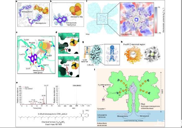 圖4、a)Huc低聚物的低分辨率冷凍電鏡重建中與Huc結(jié)合的甲基萘醌對(duì)應(yīng)的密度。b)對(duì)應(yīng)于Huc二聚體高分辨率冷凍電鏡圖中結(jié)合甲基萘醌的密度。由于掩蔽和對(duì)稱(chēng)性平均,這些圖中沒(méi)有甲基萘醌尾部的密度。c)在遠(yuǎn)端[3Fe-4S]簇的電子轉(zhuǎn)移距離內(nèi),HucS亞基對(duì)甲基萘醌頭基的協(xié)調(diào)。d)在高分辨率Huc冷凍電鏡密度圖中觀察到HucS的Tyr229的兩種構(gòu)象。Tyr229在甲基萘醌存在時(shí)采用開(kāi)放構(gòu)象(頂部),而在甲基萘醌結(jié)合時(shí)采用互斥的閉合構(gòu)象(底部)。e)對(duì)純化Huc中的Folch提取物進(jìn)行高效液相色譜-質(zhì)譜(LC-MS)分析?;迳V圖(左)顯示在24.6分鐘處有一個(gè)實(shí)質(zhì)性峰,對(duì)應(yīng)于m/z=804.66455(右)處的離子,這與β-二氫甲基萘醌-9的銨加合物一致,m/z=804.66531(下)。f)中心腔體Huc的混合棒和靜電表面表示,表明腔體表面襯有疏水殘基。g)HucM四聚體的視圖,顯示了封閉Huc內(nèi)部疏水室頂部的脂質(zhì)密度的存在。HHucM C端管的自上而下視圖,顯示管的內(nèi)部排列有疏水殘基(左),并且可以容納甲基萘醌分子(右)。i0Huc還原甲基萘醌的模型,使用大氣H2氧化產(chǎn)生的電子。