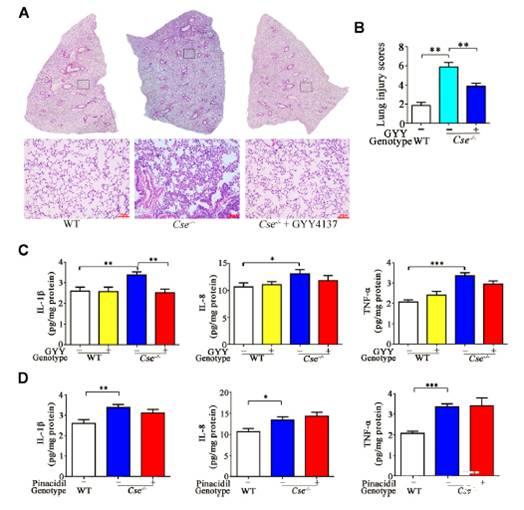 圖5、GYY4137治療可改善Cse-/-小鼠肺組織的病理改變并抑制炎癥。WT和Cse-/-小鼠用鹽水、GYY4137(50mg/kg)或吡那地爾(2.8μmol/kg)給藥。注射后24小時處死小鼠,然后收集肺組織進行形態學分析和促炎細胞因子的測定。(A)WT和Cse-/-小鼠肺組織H&E染色的代表性圖像,用鹽水或GYY4137處理。(B)、WT和Cse肺損傷評分的累積數據-/-用生理鹽水或GYY4137處理的小鼠。(C)、用鹽水或GYY4137處理的WT和Cse-/-小鼠肺組織中的IL-8、IL-1β和TNF-α水平。(D)WT和Cse-/-小鼠肺組織中的IL-8、IL-1β和TNF-α水平,生理鹽水或匹那地爾處理。