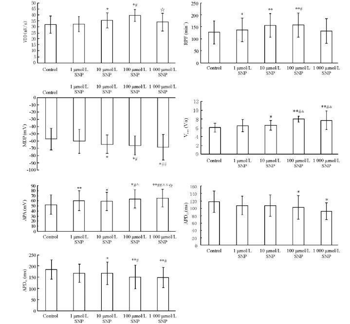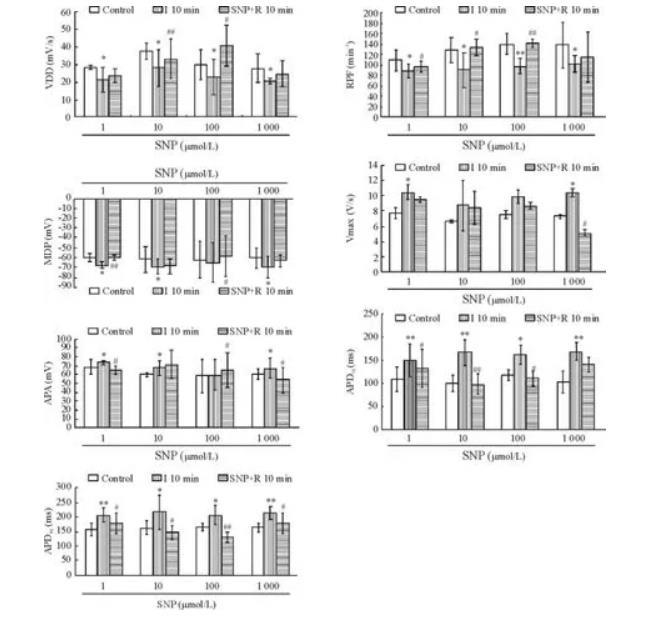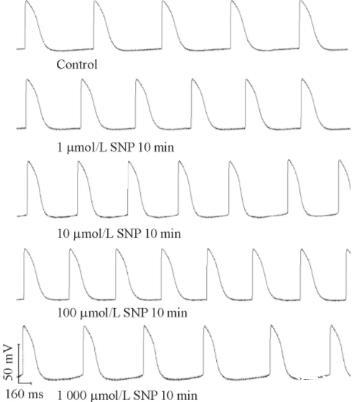 與對照組相比,MDP絕對值呈濃度依賴性增大,1~1000μmo/L SNP均可使VPA增大,Vmax呈濃度依賴性加快,以1 000μmol/L SNP效應最明顯,100和1 000μmol/L SNP組APD50和APD90顯著縮短,其中APD90的縮短更明顯(P<0.01),見圖1、2。