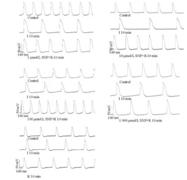 待自發節律穩定30 min后,開始采集一組正常的自發慢反應電位作對照,然后采用一定濃度的藥液進行灌流,實時記錄并分析各種因素對豚鼠左心室流出道自發慢反應電位的影響。為保證藥效,各種藥液均在實驗前1 h內配制。實驗分組如下:(1)SNP對豚鼠左心室流出道自律性電活動的影響研究:SNP分為4個濃度組:1、10、100、1 000μmol/L SNP組,每個濃度組灌流10 min;(2)SNP對I/R豚鼠左心室流出道自律性電活動改變的影響研究:采集對照自發慢反應電位,停灌10 min待電位出現明顯改變后,再分別以含有1、10、100、1 000μmol/L SNP的灌流液再灌10 min,分別記錄對照組、停灌10 min組(I 10 min)和不同濃度SNP再灌10 min組(SNP+R 10 min)自發慢反應電位的改變;(3)I/R時豚鼠左心室流出道自律性電活動的改變研究:采集對照自發慢反應電位,停灌10 min模擬缺血,然后以正常灌流液再灌,分別記錄對照組、停灌10 min組(I 10 min)、再灌10 min組(R 10min)自發慢反應電位的改變,作為SNP對I/R電生理效應的對照。