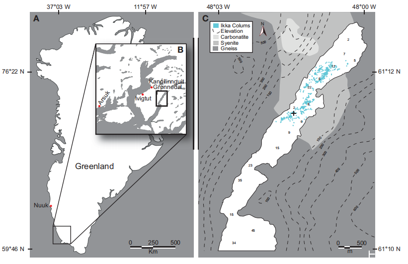 圖1、|伊卡峽灣(A)標示格陵蘭地圖,伊卡峽灣位于西南部。(B)伊卡峽灣及鄰近的峽灣。(C)自(B)中插圖,顯示伊卡石柱的分布,以及周圍山區(qū)礦物質(zhì)的粗略概述,通過等高線顯示地形,伊卡石鈣華的分布用藍色點標示