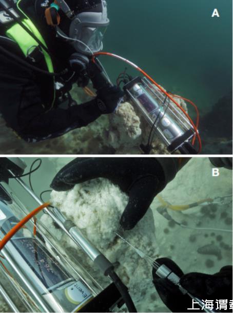 圖2|伊卡石柱。(A)潛水員在距平均海平面7米深處進行水下微剖面pH值測量。(B)近景照片顯示潛水員操作的針狀氧氣傳感器連接到水下微傳感器儀表上。潛水員使用針狀傳感器上的標記,小心地將傳感器插入多孔伊卡石基質(zhì)進行測量。